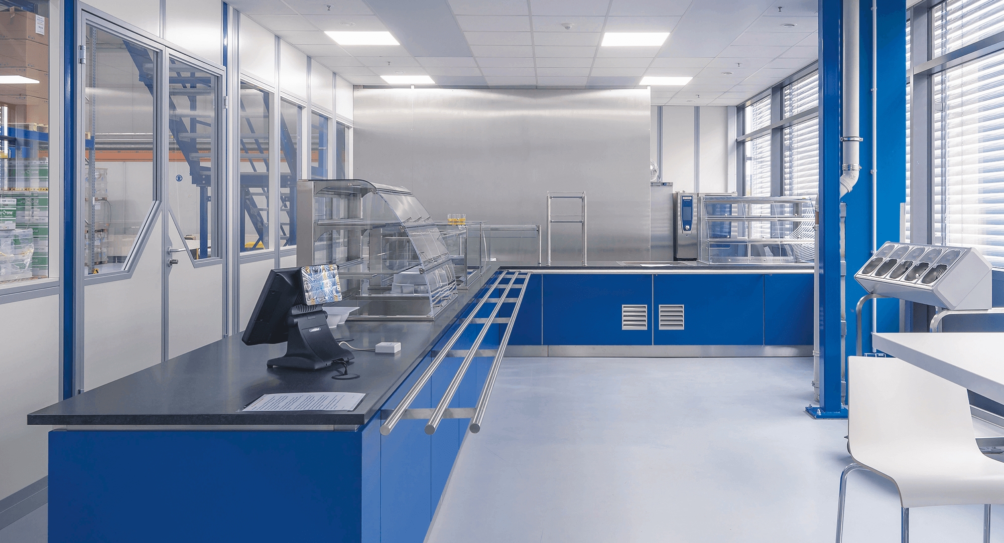 Der Hauptsitz in Würzburg verfügt über 20.000 m² Lager- bzw. Produktionsfläche und weitere 5.000 m² für Büros. Um auch innerhalb der Halle gesonderte Flächen für beispielsweise Büroräume, Aufenthalts- oder Werkstattbereiche in Produktionsnähe zu ermöglichen, errichtete KLEUSBERG mehrere Trennwandanlagen mit einer Gesamtlänge von ca. 70 m sowie Systemräume, die einer Fläche von 800 m² entsprechen. Die unterschiedlichen Aufstellungsmöglichkeiten des Systems TRENDLINE bieten eine optimale Flächenausnutzung. So wurde ein Hallenbüro mittels Stahlbaubühne aufgeständert und die Fläche unterhalb des Büros für einen weiteren Werkstattbereich nutzbar gemacht. An einer anderen Position schuf man neue Räume ohne von Staplern genutzte Fahrwege zu versperren, indem ein Hallenbüro im Obergeschoss auskragend ausgeführt wurde. Dass auch die Integration bestehender Hallenwände möglich ist, zeigt die 2-geschossige Anlage, in der für va-Q-tec zusätzliche Büroräume, Sanitärbereiche und eine großzügige Kantine untergebracht werden konnten. Das Gebäude wurde als 3-seitige Ausführung geplant. Die Anbindung an die Bestandswand ermöglicht die Nutzung vorhandener Fensterflächen, durch die zusätzliches Tageslicht in die Räume fällt. Um die Gefahr vor Glassplittern innerhalb der Produktion möglichst gering zu halten, wurden die Scheiben der Bürobereiche mit VSG-Glas ausgeführt. Zudem sah das Brandschutzkonzept des Kunden den Einsatz von A-Baustoffen vor, sodass die einzelnen Sandwichpaneele der Systemräume eine Mineralwoll- statt Polyurethanhartschaumfüllung erhielten. Die Elektroinstallationen sowie der Einbau von Klimatechnik erfolgten bauseits. Zum Kühlen und Heizen nutzt va-Q-tec Deckenstrahlplatten. Es handelt sich dabei um wärme- oder kälteabgebende Kassetten, die waagerecht unter der Decke aufgehängt werden. Standardgemäß sind die Decken der Systemräume für eine Traglast von 100 kg/m² ausgelegt. Um diese auf 150 kg zu erhöhen, hat KLEUSBERG diverse Umbrüche vorgenommen und die Sandwichpaneel-Decken mit Stahlrohren ausgesteift bzw. aufgerüstet. Die Trennwände erhielten zum Teil vollautomatische, doppelflügelige Schiebetüren, sodass der Werksverkehr nicht gestört wird und eine barrierefreie Zufahrt weiterhin gewährt bleibt. Der Rammschutz, die Stahlbaubühnen, Stützen sowie der Dachabschluss wurden auf Kundenwunsch in Enzianblau umgesetzt. Optisch fügen sich die Einbauten somit optimal in die bestehende Halle ein, weshalb ein sehr ansehnlicher und hoch funktionaler Gesamteindruck entsteht.